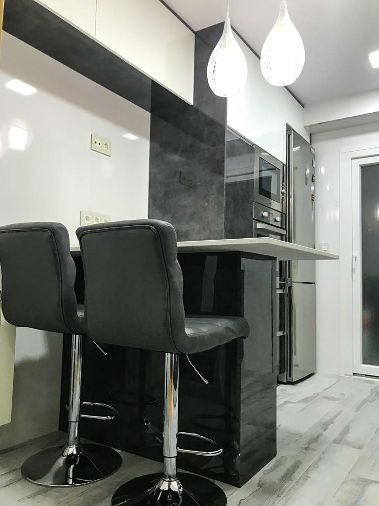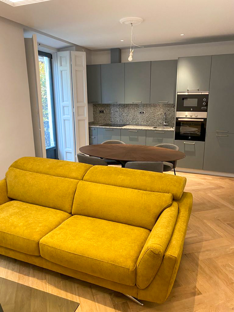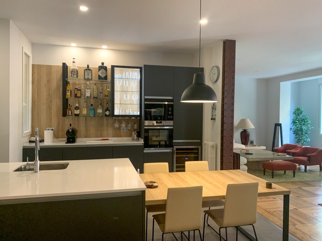 Amplia cocina integrada en salón, marcada en tonos oscuros, en pleno barrio de Salamanca.